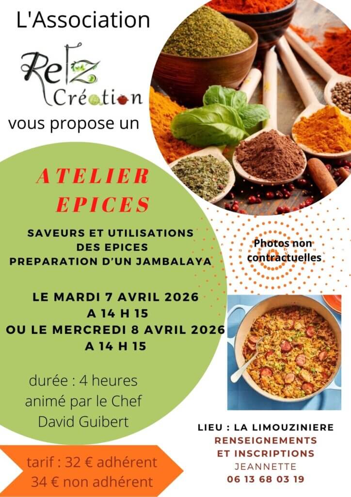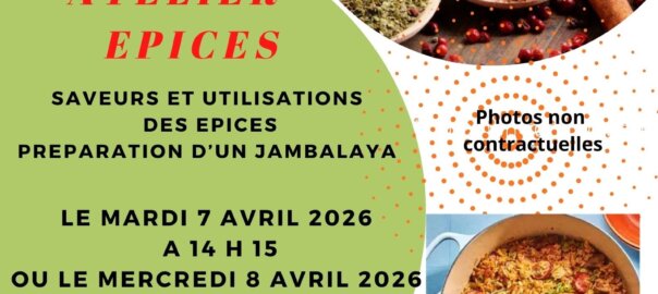 Atelier culinaire sur le thème des épices les 7 et 8 avril 2026 2 mars 2026Actualité, Bandeau Défilant, StagesVéronique Chauvel bulletin inscription atelier culinaire épicesTélécharger